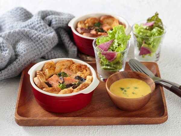 - 1クロワッサンは厚さ5mmに切る。秋鮭は一口サイズに切って塩、こしょうで下味をつける。玉ねぎは薄切りする。マッシュルームは5mm幅に切る。ブロッコリーは半分に切る。