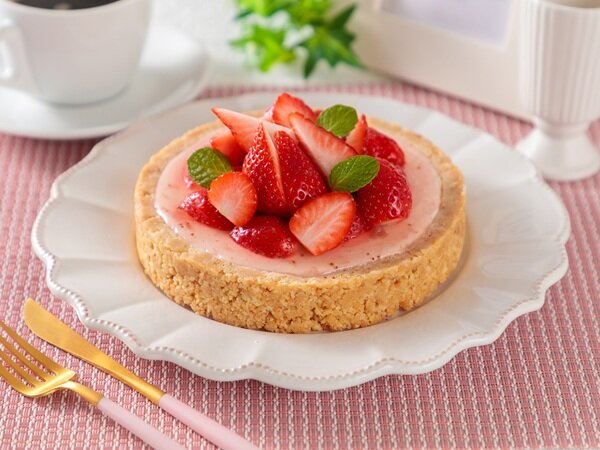 - 4固まったパイの中央に薄切りにしたイチゴを飾り、水でのばしたジャムを塗る。