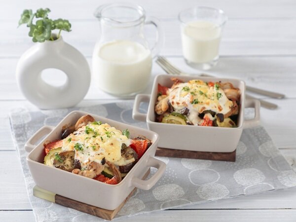 - 4③をグラタン皿に移しトマトをのせて、①のソースを全体に回しかけ、ピザ用チーズを散らし、あらかじめ200℃に余熱したオーブンで約10分焼く。
