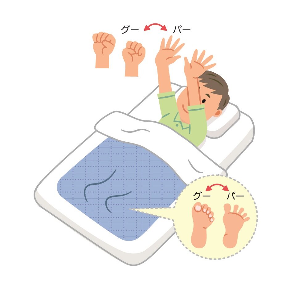 ①目覚めたら、布団の中で手足の指をにぎったり、広げたり、グーパーの動きをくり返す。