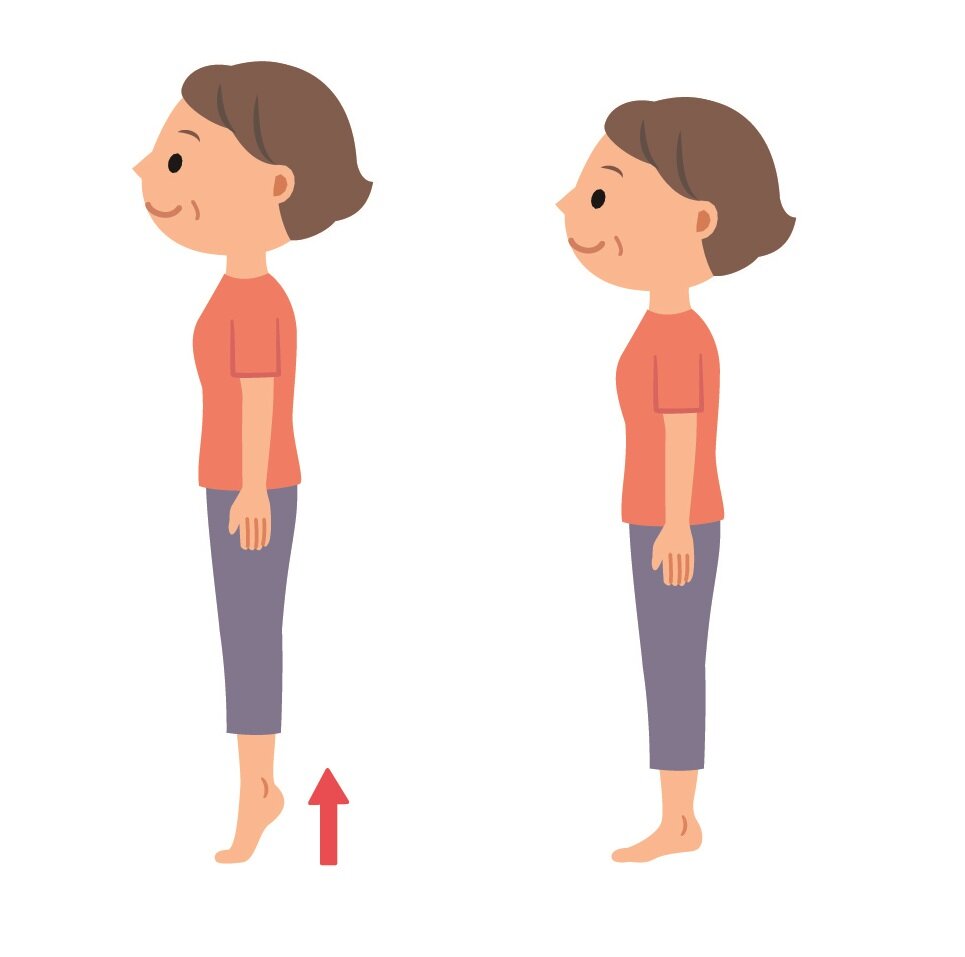 グラグラしてしまう人は、壁に手を着いてもOKです。また、立ったまま行うのが難しければ、イスに座ってかかとを上下させてください。